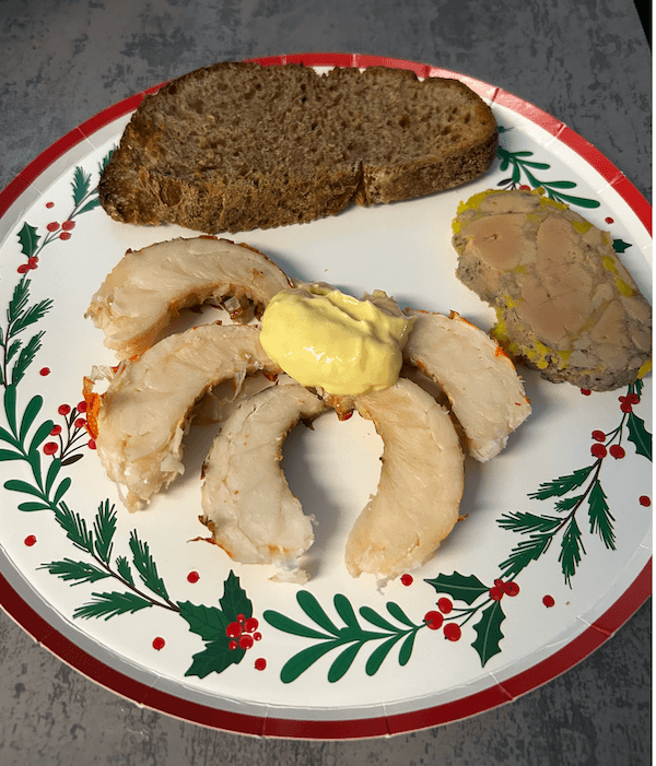To start this festive dairy-free Christmas menu, I served a land-and-sea platter with homemade foie gras, lobster tail with aioli, and rustic whole-wheat Dutch oven bread. Light yet full of character, it sets the tone for a refined and indulgent holiday meal.