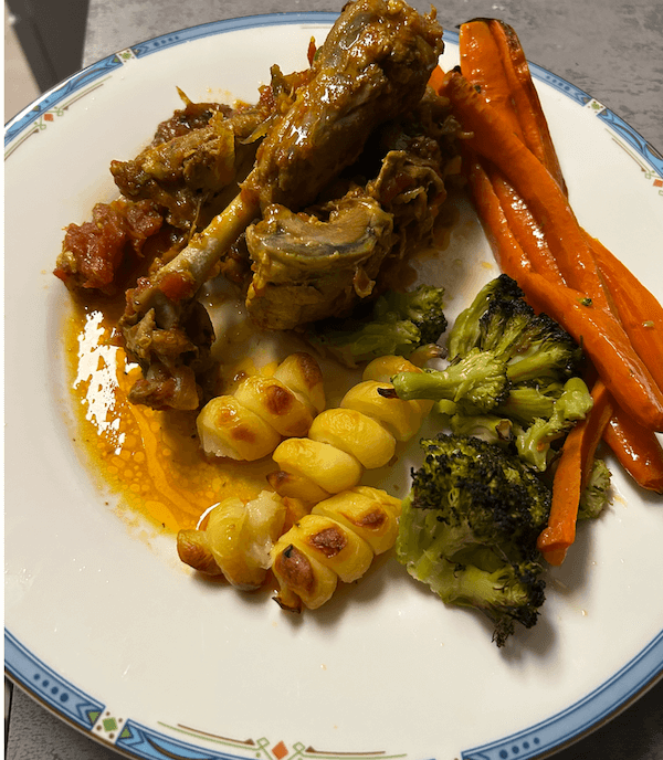 une pintade parfumée au combava, subtilement acidulée, accompagnée de légumes grillés (broccoli, pomme de terre (découpée en torsades et carottes en battonnets) , fondants à l’intérieur et légèrement croustillants à l’extérieur. Un plat simple en apparence, mais riche en goût, qui donne immédiatement une ambiance de fête.